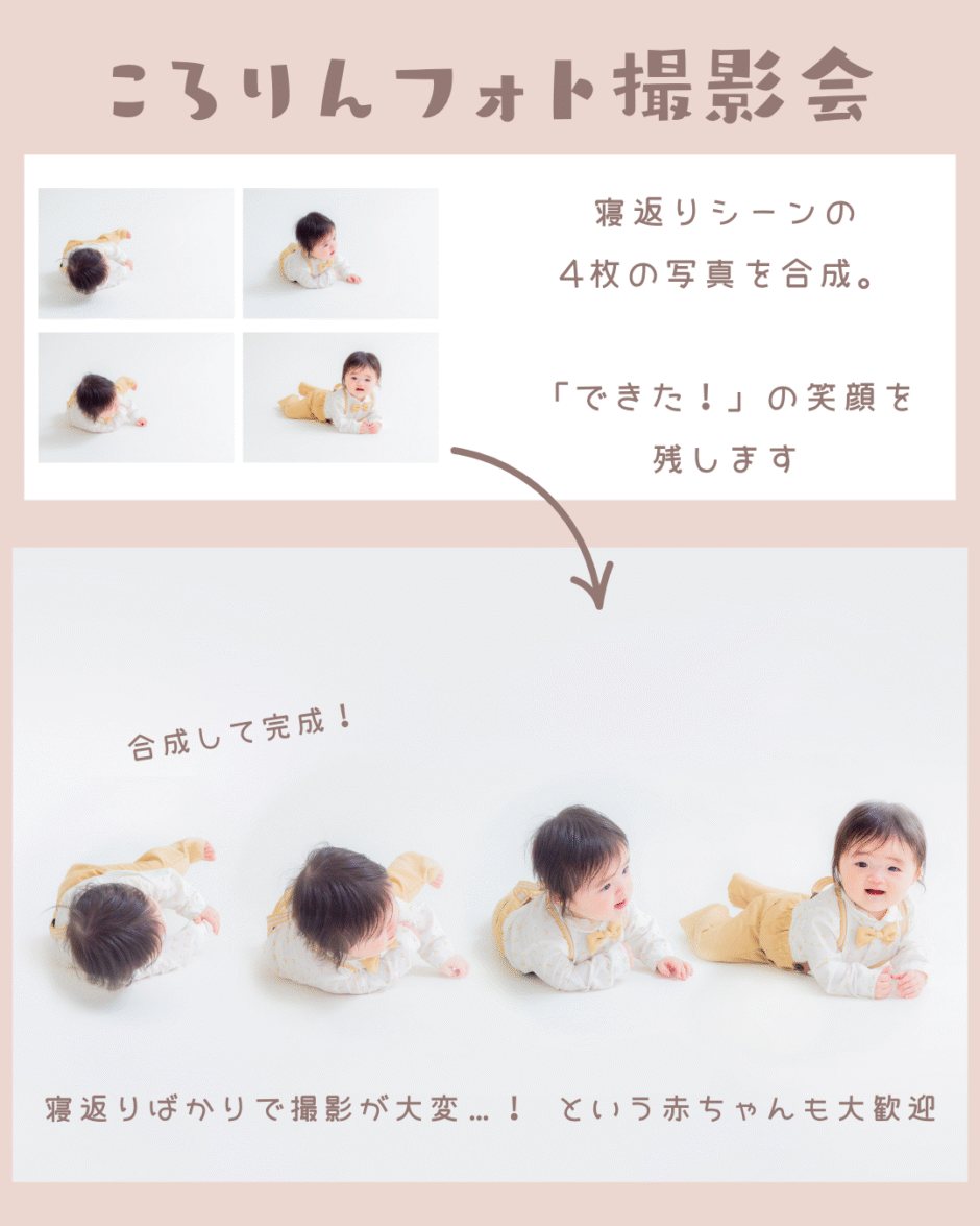 寝返りも上手・ソロ写真もお肌の透明感が綺麗に出る感じで撮影出来ました。